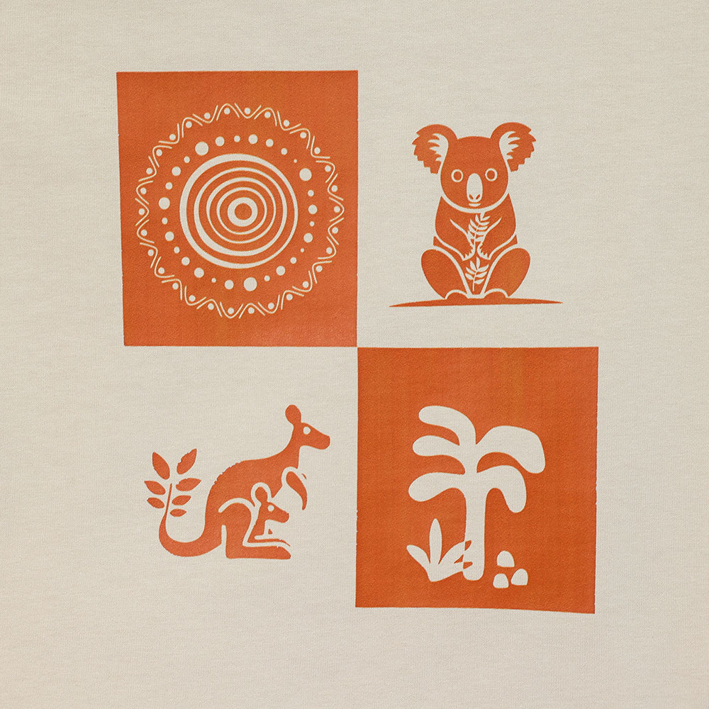 Celebrate Australia’s wildlife and culture with this 100% cotton tee, featuring Aboriginal-inspired art of a koala, kangaroo, and nature elements.