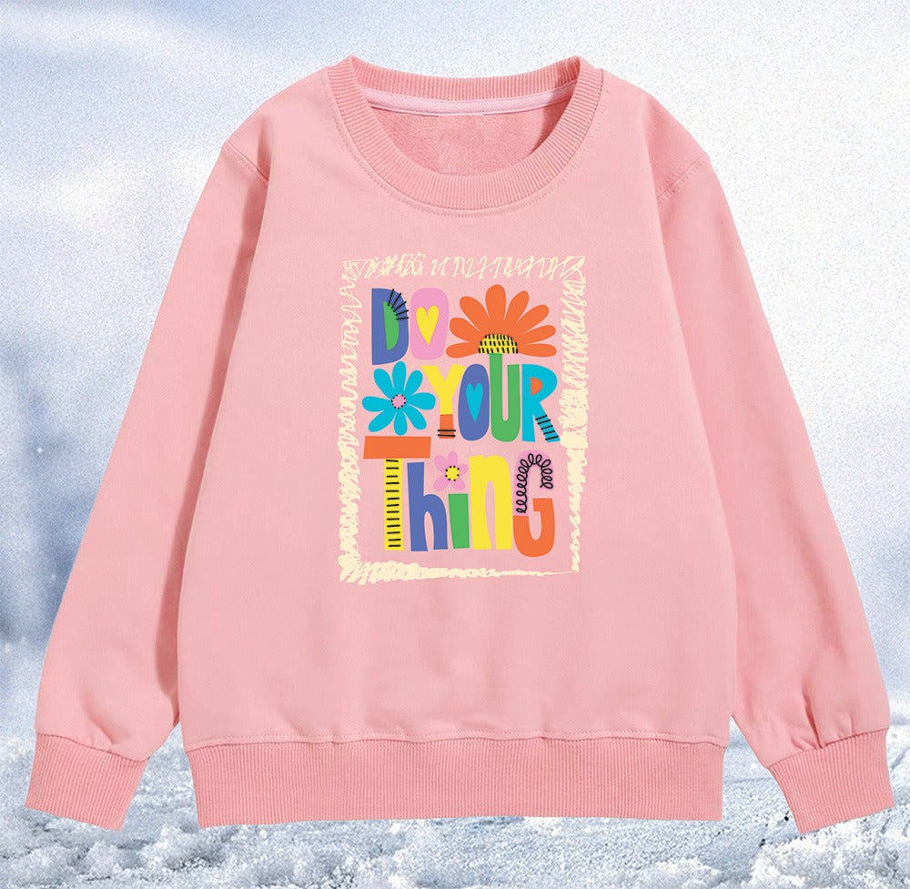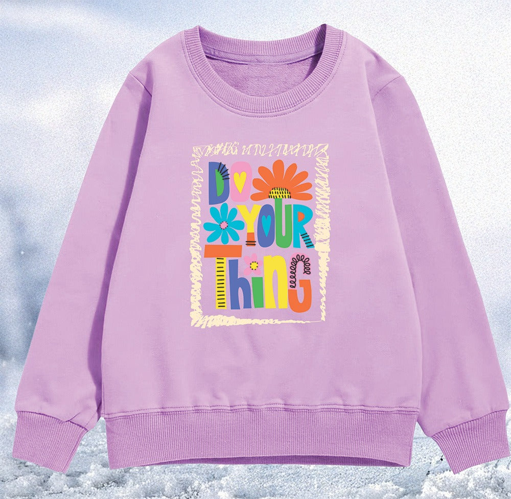 Let their personality shine in this bright and cheerful sweatshirt! With a bold “Do Your Thing” graphic and playful floral pops, this lilac crewneck is made for kids who love to express themselves — their way, every day.